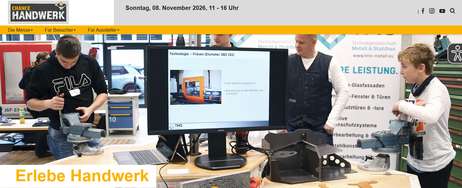 | | | | | | | Ausbildungsmesse "Chance Handwerk" am 08.11.2026 | Am 08.11.2026 startet wieder von 11.00 Uhr bis 16:00 Uhr unsere Ausbildungsmesse "Chance Handwerk". Über drei Etagen präsentieren Ausbildungsbetriebe aus dem Handwerk ihren Betrieb und Ihre Ausbildungsmöglichkeiten. Die Teilnahme für die Betriebe ist kostenfrei. Wenn Sie gerne als Aussteller dabei sein möchten und sich noch nicht angemeldet haben, melden Sie sich gerne bei mir oder füllen Sie die Anmeldungskarte auf der Website zur Messe aus und mailen mir diese. Auf www.chance-handwerk-trier.de können Sie sich bereits jetzt einen Eindruck von der Messe verschaffen. Übrigens: Die Messe startet an einem Sonntag!